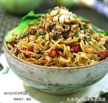 9)舀上一勺炒好的肉末芽菜,花生粒拌匀即可