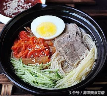 11)冰凉的冷面团成面团,放在一只大碗里,黄瓜丝、梨丝(苹果丝)、泡菜、牛肉片、半个鸡蛋放上去